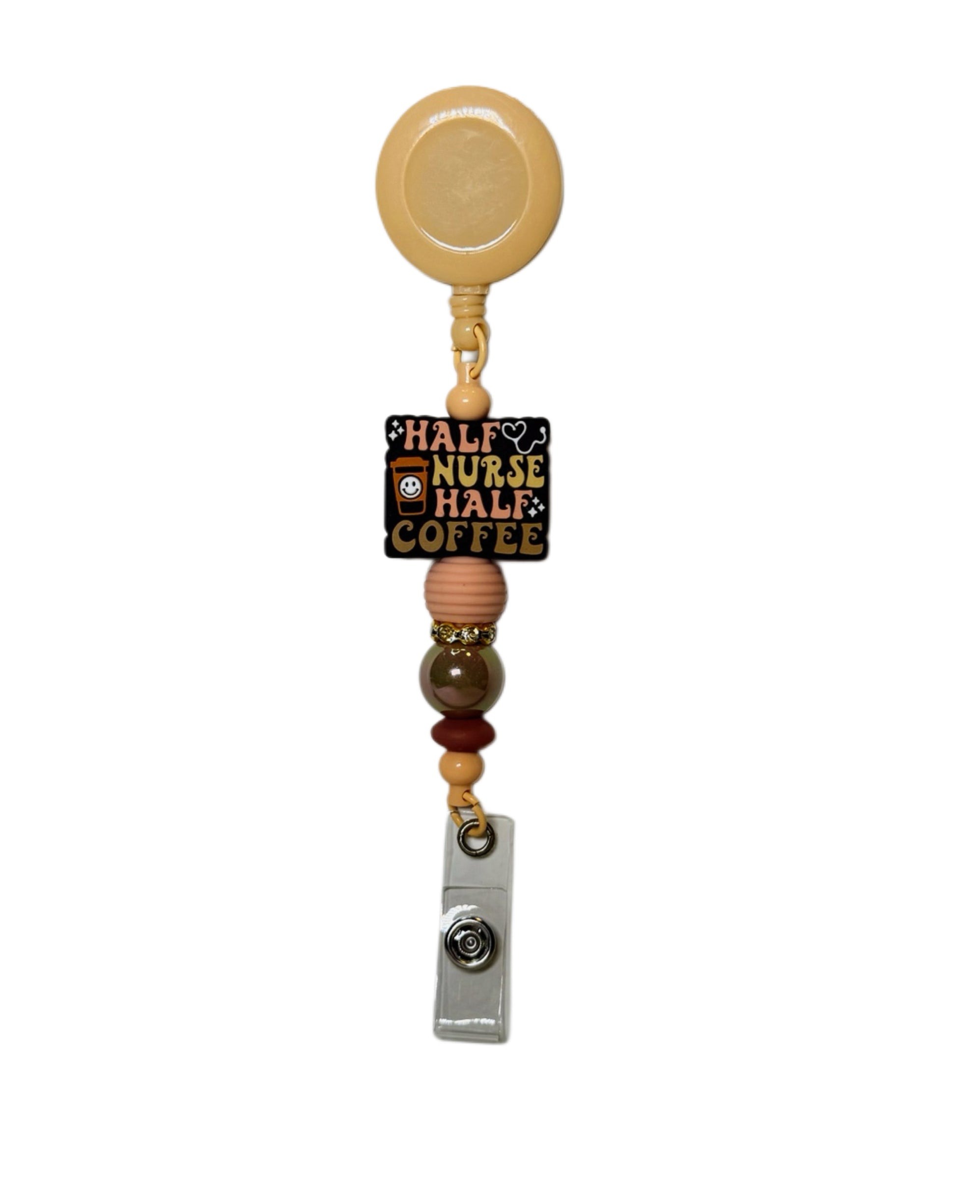 Daisy Nurse har grønne og beige perler, blomster og teksten “Nurse”.